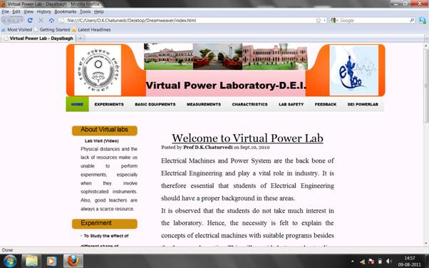 Prof. Chaturvedi and his team developed a virtual lab in the area of electrical power systems under the initiative of MHRD, Govt. of India. The purpose of this lab is to help the students of engineering colleges where quality labs/staff not available or wants to do engineering through correspondence or in distance mode. The home page of virtual power lab is given below: