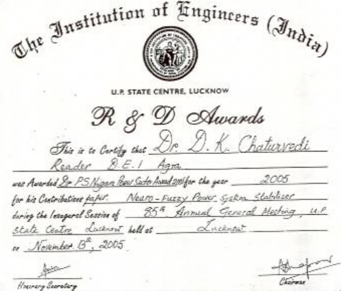 For the contribution in Research and Development in electrical technology during last 5 years and the efforts have greatly benefited the state of U.P. The Institution of Engineers (India) presented R & D award and a Cash prize of Rs. 2,500/- in the 85th Annual General Meeting, U.P. State Centre, Lucknow on Nov. 13th, 2005 on the paper "Neuro- Fuzzy Power System Stablizer". A citation is also presented on this occasion. |