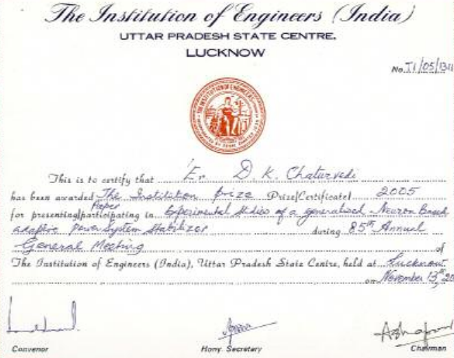 The Institution of Engineers (India) U.P. State Centre presented the Institution prize of Rs. 2000/- and a certificate for best technical paper presented in 85th Annual General Meeting, U.P. State Centre, Lucknow on Nov. 13th, 2005. The topic of the paper was "Experimental Studies of a generalized Neuron Based Adaptive Power System Stabilizer". |
