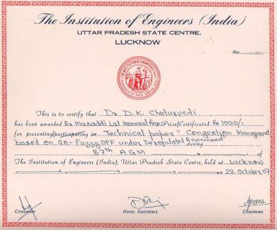 In the 87th Annual General Meeting of The institution of Engineers (India), U.P. State Centre, Lucknow on Oct 28th, 2007 on the paper titled, "GA-Fuzzy Technique and it s a pplica t io n ". This award includes a cash prize of Rs. 2000/-. Prof. D.K. Chaturvedi receiving Award at Luknow, 2007. |