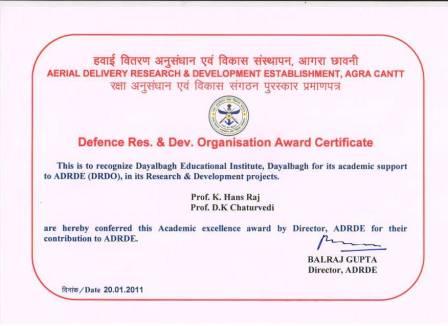 Aerial Delivery Research and Development Establishments (ADRDE) DRDO Lab recognized Dayalbagh Educational Institute, Dayalbagh for academic support to ADRDE (DRDO), in its research & Development projects. Prof. Chaturvedi has been conferred the Academic Excellence Award by Director, Aerial Delivery Research and Development Establishments (ADRDE) DRDO Lab at Agra for his contributions to ADRDE. |