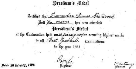 For securing highest marks in all postgraduate classes in XII Convocation of D.E.I. (Deemed University), Dayalbagh, Agra in 1993.