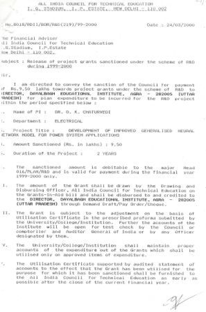 - AICTE R & D Project, Development of Improved Generalized Neural Network Model for Power System Applications, (F.No. 8018/RDII/BOR/R&D (219)/99-2000), Rs.9.5 Lakhs, 2-Years(31.3.1999- 31-3-2002).(completed)