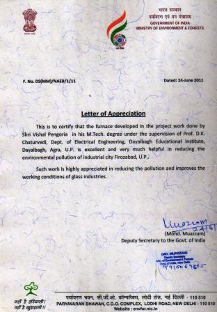 - The Ministry of Environment and Forrest, Government of Indi, New Delhi has given a letter of appreciation to Prof. D.K. Chaturvedi for guiding the project work of Mr. Vishal Pengoria on the development of a new Gas Fired Furnace for small scale industries of Firozabad.U.P. Such work is highly appreciated in reducing the pollution and improves the working conditions of glass industry.