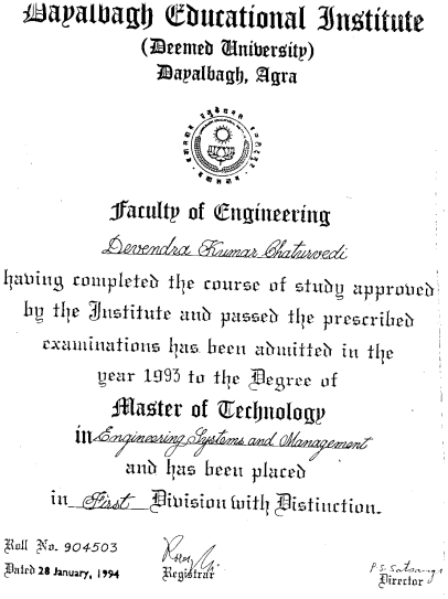 M.Tech.(Engg. Syst. and Management), DEI, Agra (U.P.), India, 1993.
