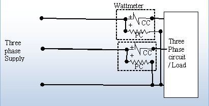 three wire system) or load is delta connected then power measured by two wattmeter method as shown in Fig. 6